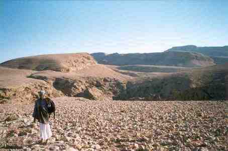 Majlis Al Jinn itself was mentioned in a recent issue of Oman Today, but because the article failed to give instructions on how to find it, few who come this far reach that particular spot. Still, it shouldn't be that difficult to find. Basically, you go north, heading into the wadi where you have left your car. After only ten minutes walking, in order to continue north, you have to climb up the hill at the end of the wadi. If you're sharp-eyed, you'll find a faint trail leading up the rocks. From the top, you see a level plain further north. The trail to the left leads to the plain, but either direction going north will get you there.