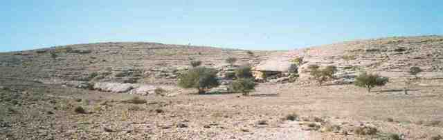By now you will have lost sight of your mushroom-shaped tree, but barely discernable trails will lead you to it, or if you lose those, you can just head north, or slightly left of north, about 330-350 degrees. About two hours out from your cars, if you are on target, you should find yourself making your way up a slight incline, a dozen or so trees lining a wadi just to your right. Ahead of you is your mushroom-shaped tree, and beyond that is a group of shorter trees with three stems close together.