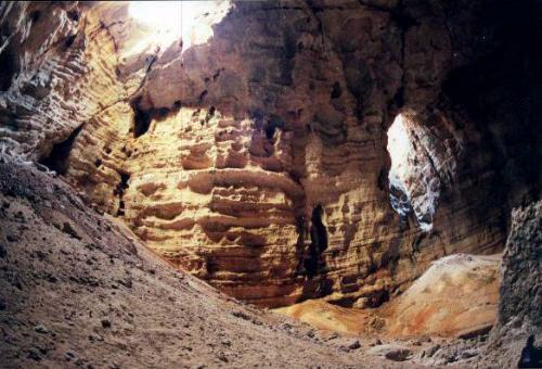Instinct will warn you to be careful around all these openings. They are all sheer drops. The bones of small goats scattered on the floor between 150-180 meters below attest to the danger to those whose instinct is less well formed. From these openings, you can see only the sides of the chasm where they are lit by shafts of light from the sun; cloaked in mysterious, seemingly impenetrable darkness are the floor of the cave far below, hiding from hikers the bones and piles of rubble of earth which at one time gave way near where you are standing and walking about with such naive confidence.