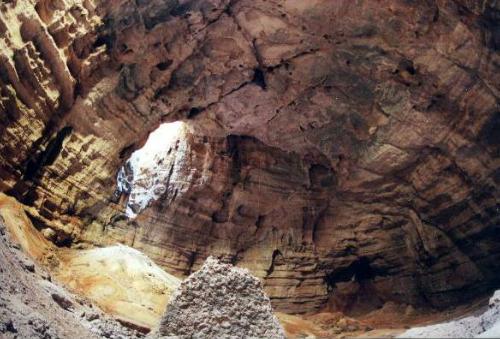 Majlis Al Jinn is one of several sink holes at 1200-1400 meters altitude in the Jebel Bani Jaber mountains between wadis Shab and Nam in Oman. This fascinating area is the site of many recent discoveries. Majlis Al Jinn itself was discovered in 1983 by Don Davidson, a geologist who was for fifteen years on the payroll of the Omani government for work entailing tasks as onerous as hiking, exploring, and abseiling.