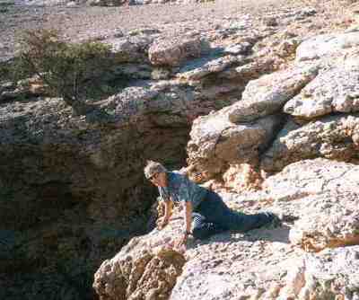 Descent into Majlis Al JinBy Vance StevensOman, Nov. 3, 1994[This is condensed slightly from an original I wrote shortly after the actual event. In the original, I tried to capture as much as possible the sensations of fear and accomplishment which I realized were waning quickly as the feat regressed. It is interesting to me how the human psyche deals with fear, but some of those immediate recollections seem a bit verbose to me now, so those are the parts where I did the most editing. Now that I've had more experience on rope, some of what I've written here seems almost embarrassing, I've since been down for a second descent/ascent (June 28, 2001), but I've tried to preserve the flavor of the first-time experience. All but two of the photos below were taken by Arthur Gregory on a visit to the area in Dec. 2000, used with his permission] GPS: UTM/UPS Oman datum IntroductionMajlis Al Jinn is the second largest cave chamber in the world. The three openings in its towering roof, the only ways in or out, resulted from cave-ins of the karst limestone rock forming the ceiling of the chamber, and the two largest of these have left rubble and boulders piled on the floor of two corners of the chamber, too far down to be seen from above. The third opening is a small fracture in the limestone roof of the cave forming a chimney about 5-6 meters across and 15 meters deep. From the top of the chimney, the chamber plunges 178 meters through awesome spaciousness to the dusty floor below. Picture credit left, Frans, Jan. 28, 2001 (me on the left, topside) |