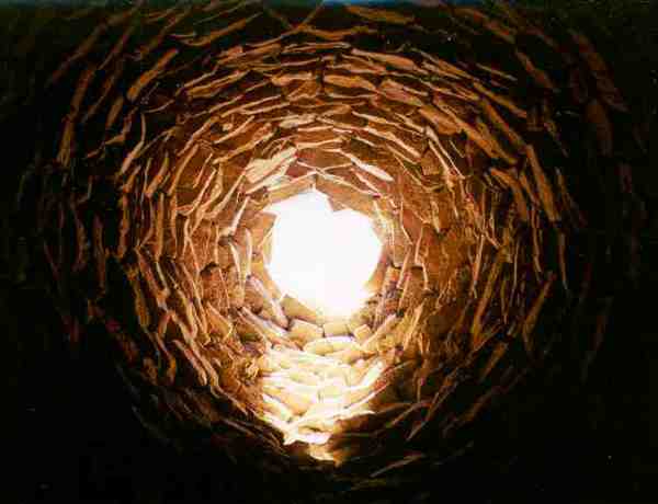 As recently as 1991, a dozen impressive 3000 year-old bronze-age tombs were discovered nearby. Standing like sentinels along a ridge overlooking rippling folds of rockscape, the tombs were built from chunks of limestone that litter the land. The rough-hewn stones were cleverly stacked to form a domed chamber surmounted by a chimney. The best examples stand some 1ten meters tall, with the outer layers of rock remarkably well coined. The inner layers are not coined, and the rough surfaces can be climbed only with difficulty, as they slope inward to form the chimney. The climber, pulling him or herself up from rock to rock, cannot help but be impressed at the structural integrity of the tombs, whose builders carefully set each unmortared stone in place, preventing for millennia the collapse that would ensue if any stones could be dislodged by the climber.