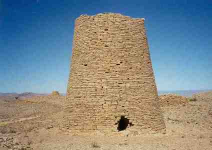 The tombs can be reached by a new dirt road bulldozed out of the escarpment. The trip takes 4 to 6 hours from Muscat, depending on driving day or night and condition of the road. The last set of tombs occupies a spot of level ground with a panoramic view which, despite the chill wind at that altitude, is much favored by campers, as there is no suitable spot for camping in the inhospitable terrain between there and the jumping off point for the Majlis area, ten kilometers away, at the end of a tortuous road leading to a village whose inhabitants migrate summers, leaving their village eerily deserted, except for flies and hornets. People visiting the tombs often drive to the village and hike into the sink hole area from the end of the road.